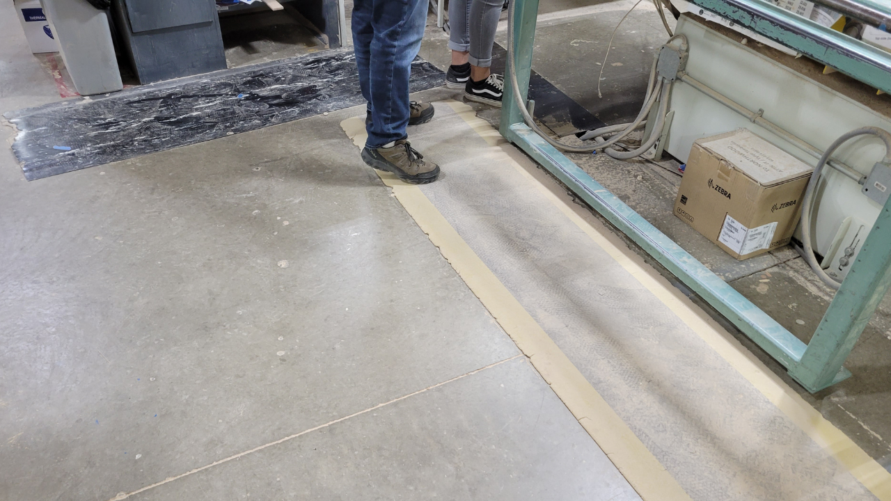 Previously, TruStile operators were hand-cutting long rolls of mat into individual pieces then laying them throughout each workstation. This was "easy," according to Andy, but led to gaps between mats, missing beveled edges, trip hazards, constant on/off stepping, ergonomic issues, and the subsequent ankle injury; an operator tripped moving from one mat to another pieced next to it.