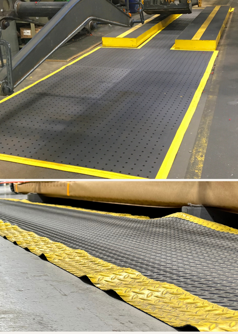 One piece custom AcroMat designed to fit. Consistent surface, consistent traction, consistent cushion. No gaps, on/off stepping, trip hazards or ergonomic risks.
