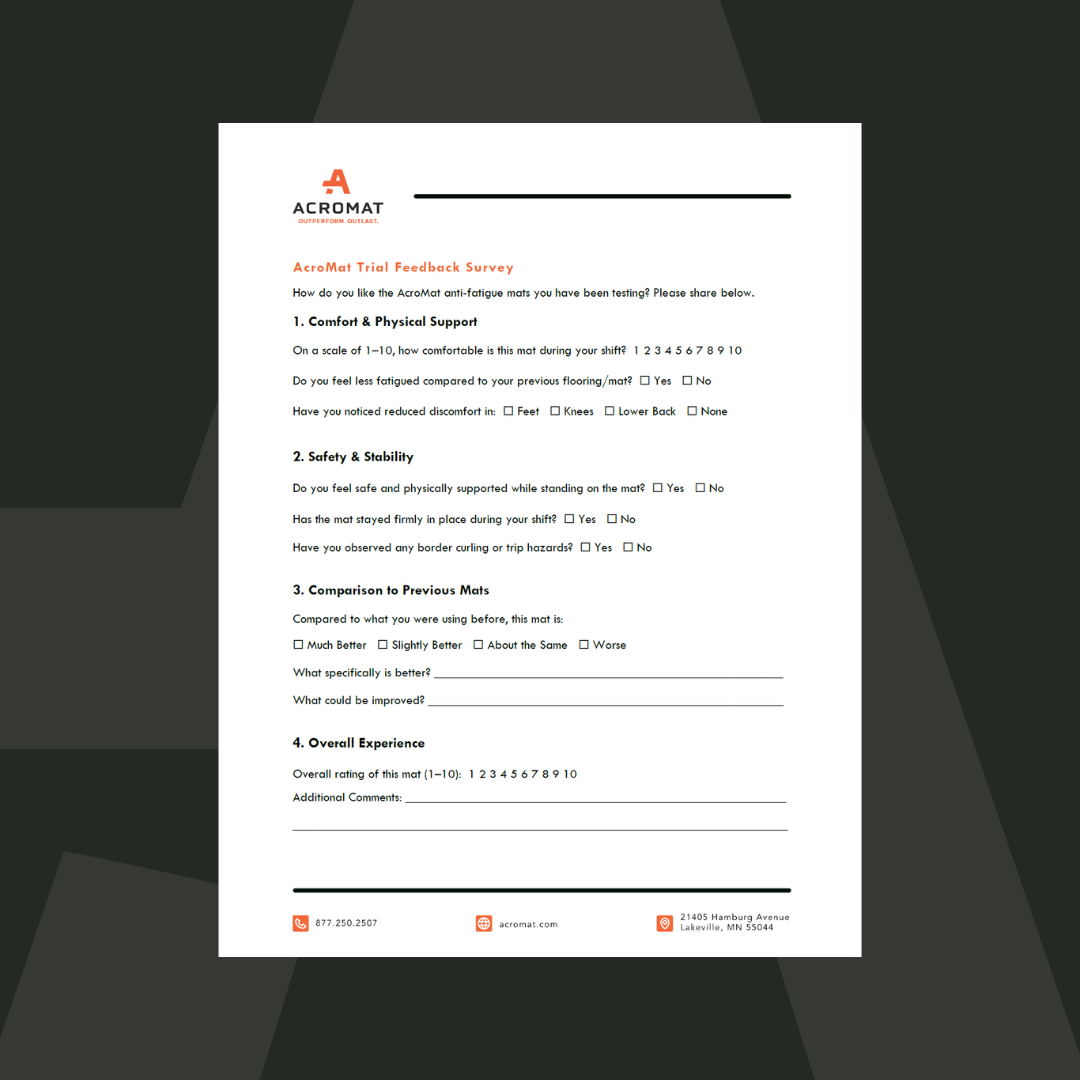 Conducting an anti-fatigue mat trial? Print and share this survey with your employees who will be using the mats every day to get honest, genuine feedback. This survey helps you create quantifiable data points you can review across departments.