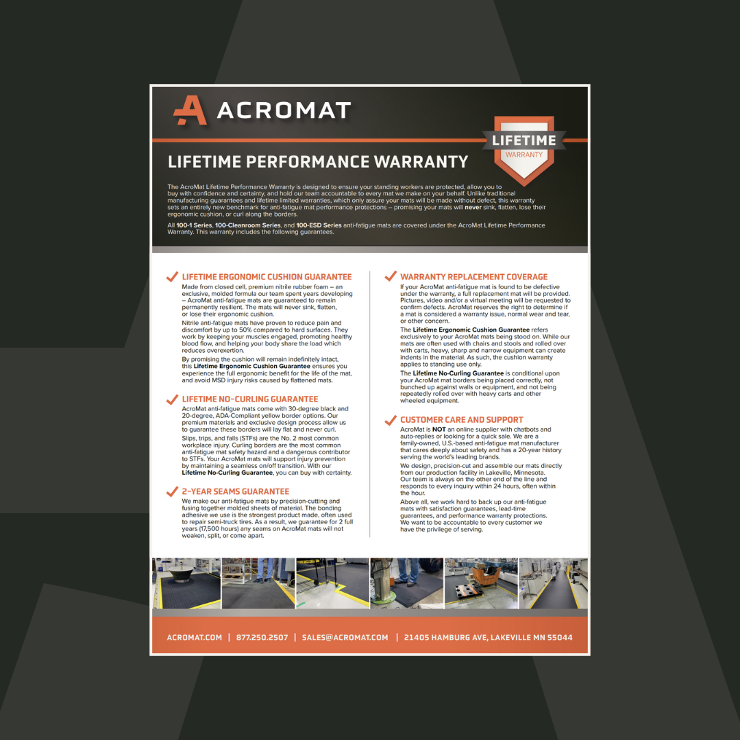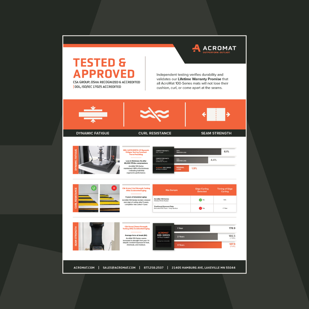Independent testing verifies AcroMat’s Lifetime Performance Warranty promise that our 100-Series anti-fatigue mats will never sink, flatten, or lose their ergonomic cushion.